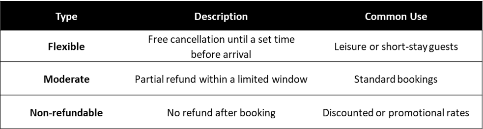 Une politique d'annulation est un ensemble de règles qui définissent comment et quand les clients peuvent annuler ou modifier une réservation, ainsi que les frais applicables. Il aide les hôtels à protéger leurs revenus en réduisant les annulations de dernière minute et garantit que les clients sont informés des coûts avant de réserver.