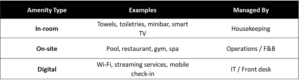 Amenities are additional features and services provided by hotels to enhance guest comfort and satisfaction. These include in-room features such as Wi-Fi, toiletries, and coffee makers, as well as property-wide facilities like pools, gyms, spas, parking, and concierge services.
